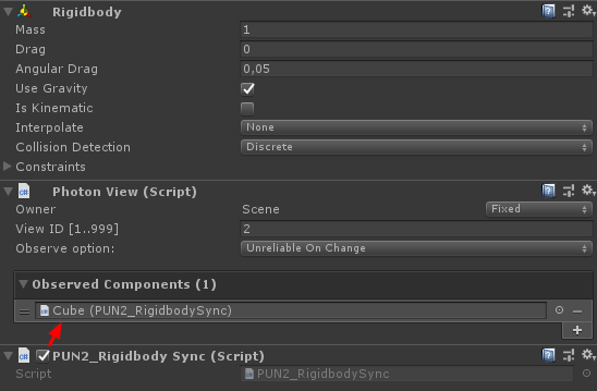 }- قم بإرفاق PUN2_RigidbodySync بكلا المكعبين وقم أيضًا بتعيينه إلى Photon View "Observed Components":