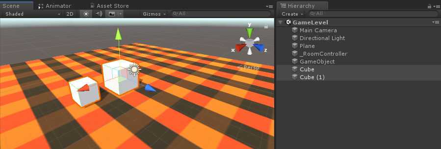 - افتح المشهد "GameLevel" وقم بإنشاء مكعبين (GameObject -> 3D Object -> Cube)