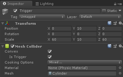 - قم بإضافة مكون MeshCollider إلى "Trigger" GameObject، وحدد مربعي الاختيار Convex وIsTrigger، وقم بتغيير الشبكة الخاصة بها إلى الأسطوانة الافتراضية